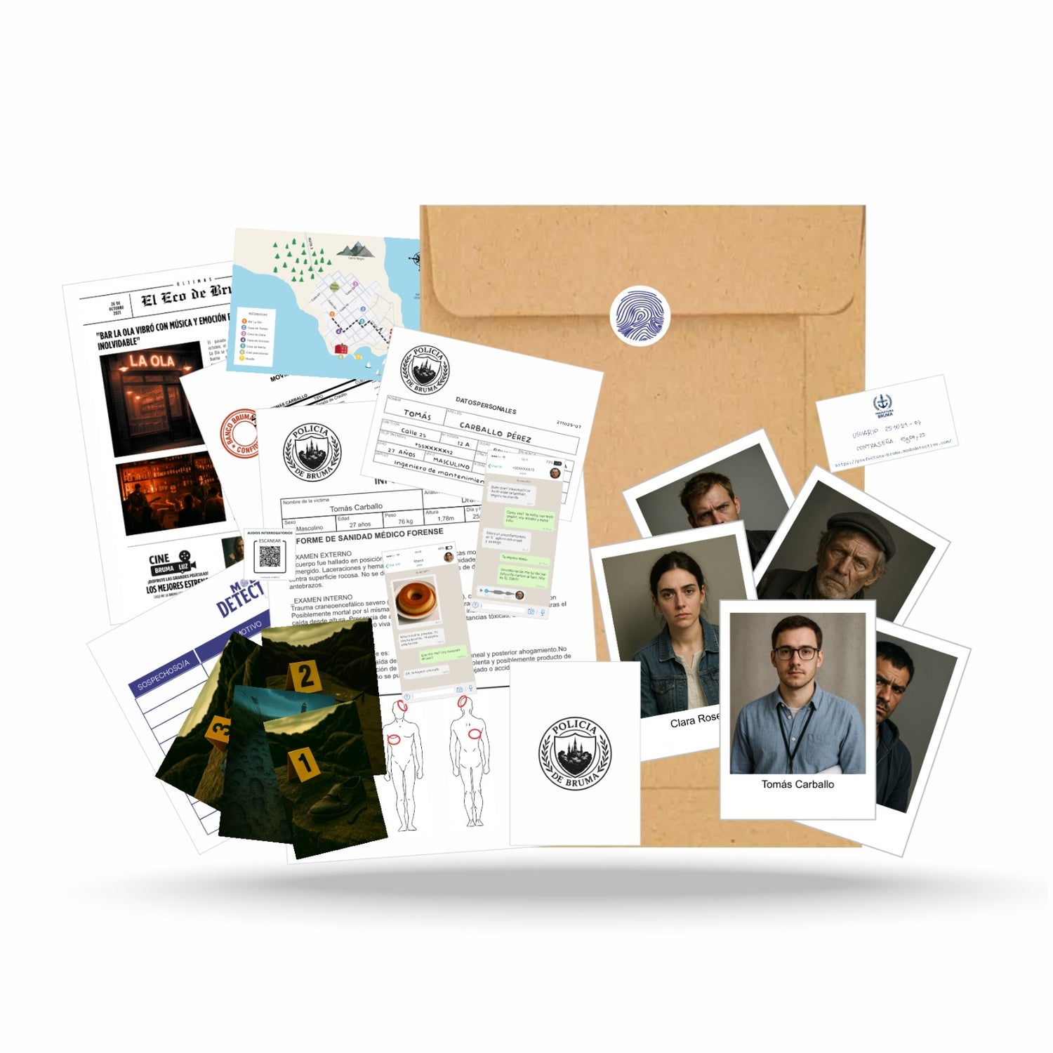 Cada caso trae todo lo necesario: ficha de personajes, interrogatorios, fotos, objetos simulados, pistas ocultas, cartas, documentos forenses y más. Todo presentado como un expediente policial.